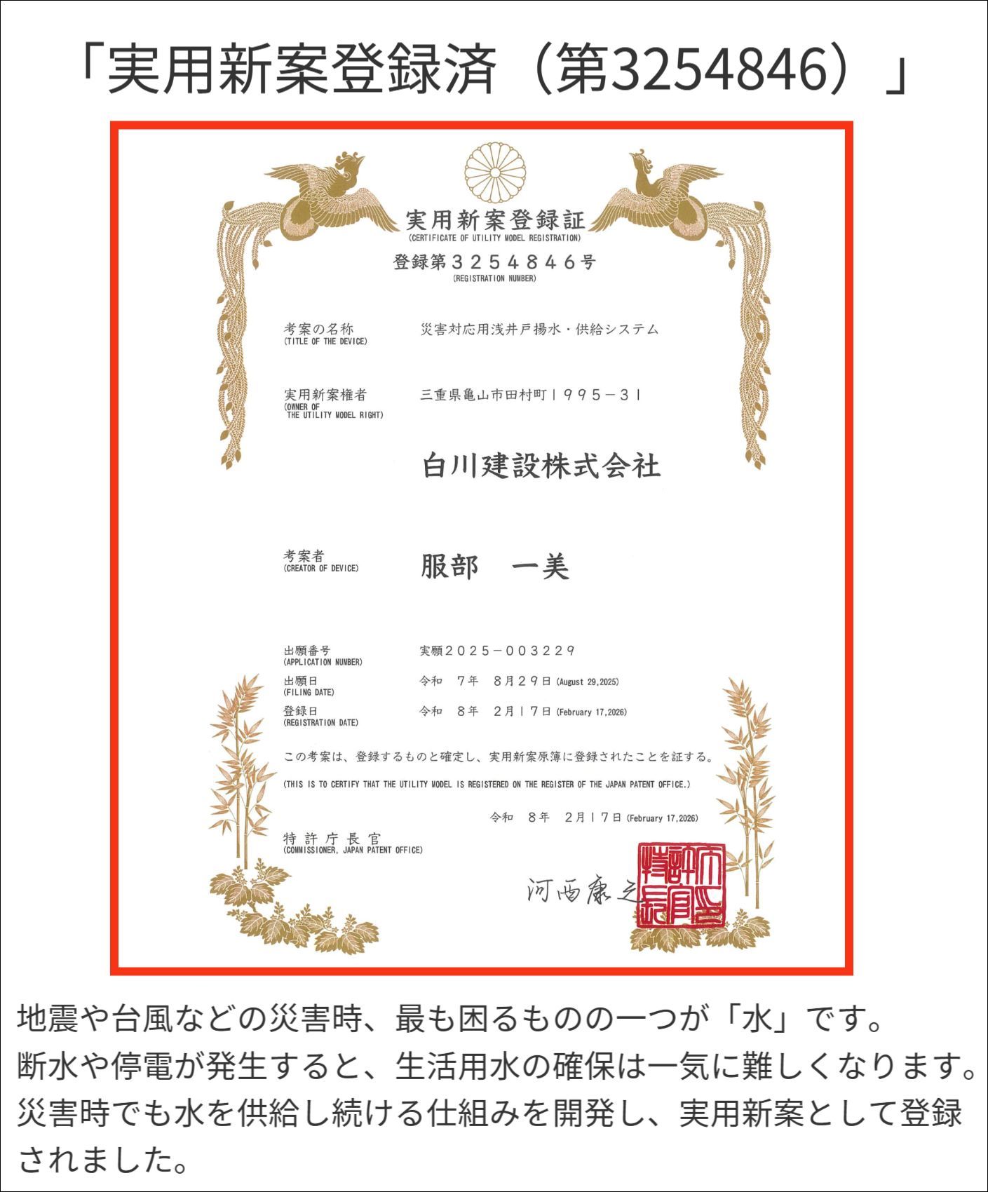 2026/2/17 【実用新案(第3254846号)】に登録されました